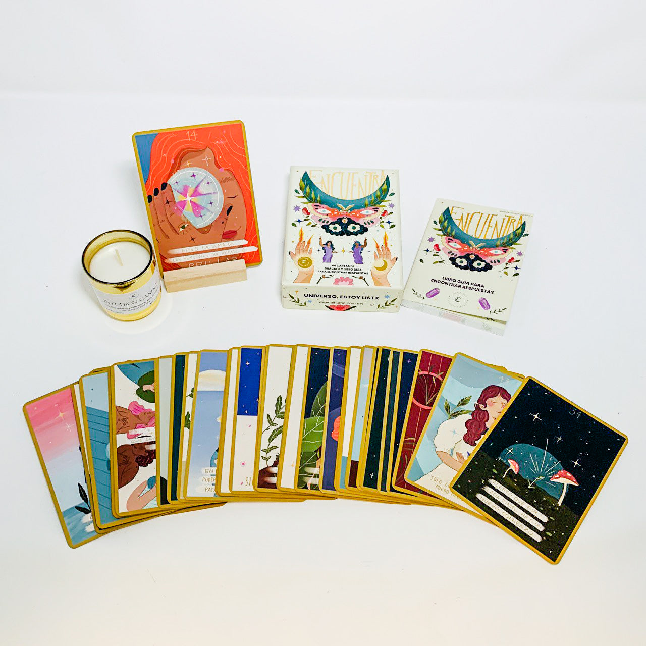El Oráculo Encuentra está producido con materiales de alta calidad para asegurar su durabilidad. Nos enorgullecemos de la resistencia y el acabado de nuestras cartas, así como de la atención al detalle en cada componente.