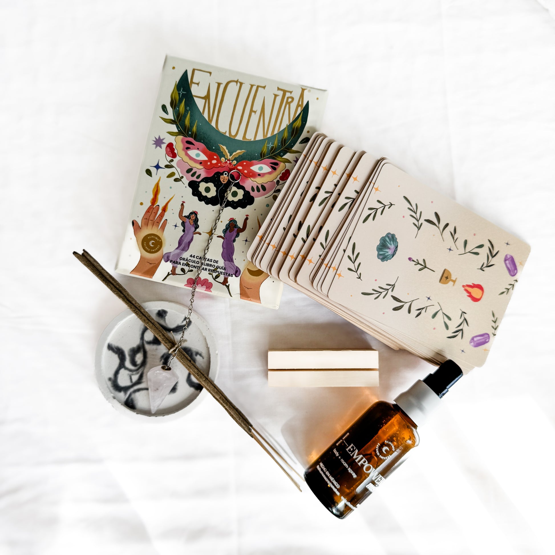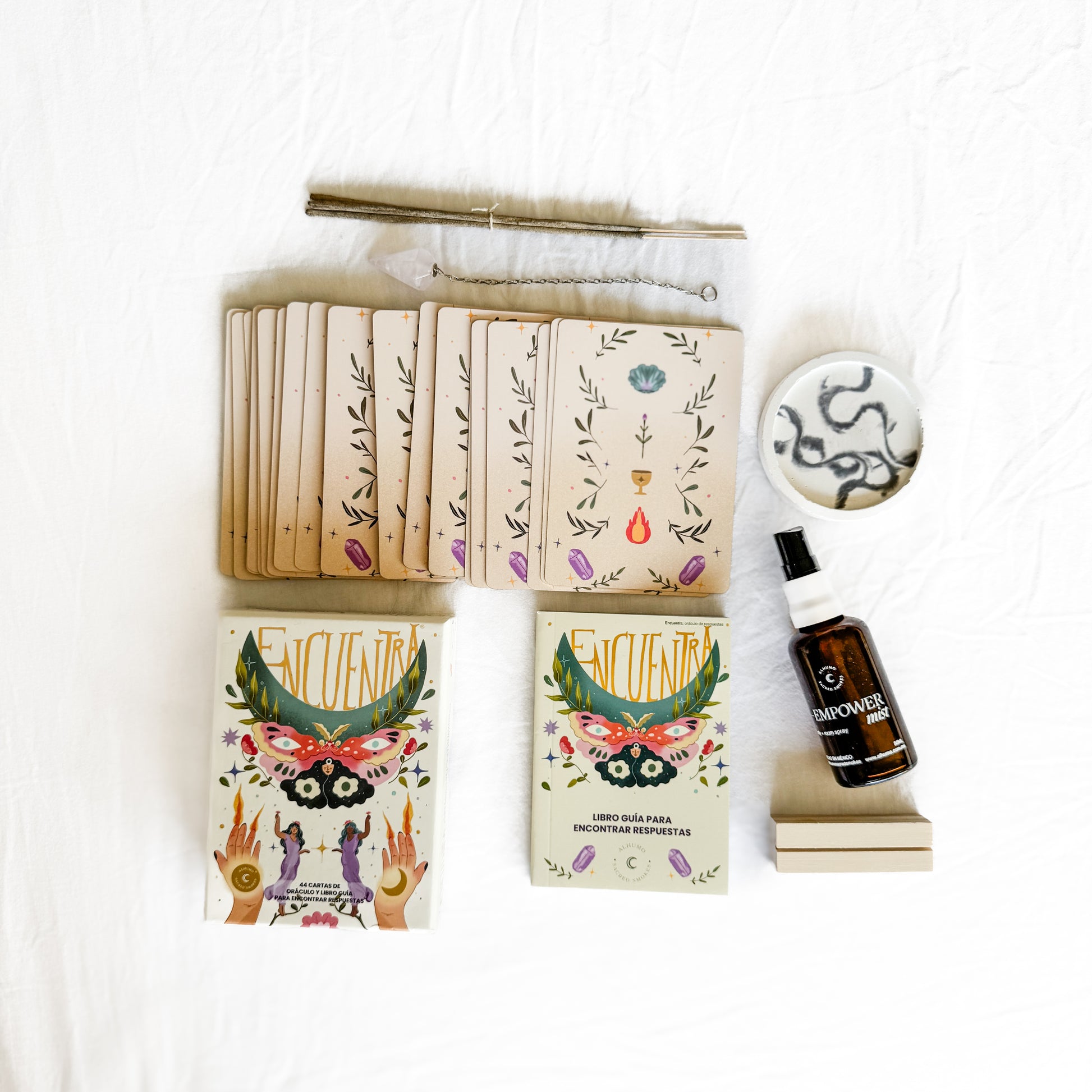 Contenido y Dimensiones⋇ Oráculo Encuentra (44 cartas + libro impreso, estuche de cartón) ⋇ Un Mist de 50 ml. elaborado con aceites esenciales de ámbar y vainilla ⋇ Péndulo elaborado con cuarzo rosa o cuarzo blanco ⋇ Una base de madera para colocar una tarjeta ⋇ 10 inciensos de sánadalo ⋇ Postal con acceso a manual digital para aprender a utilizar cada elemento ⋇ Bundle Holder de concreto estilo marmol, figura circular ⋇ Acceso a un curso digital por video y su repetición ilimitada ¡No te quedes sin este kit mágico! Aprovecha el envío gratuito. Cambia tu energía. Cumple tus intenciones.