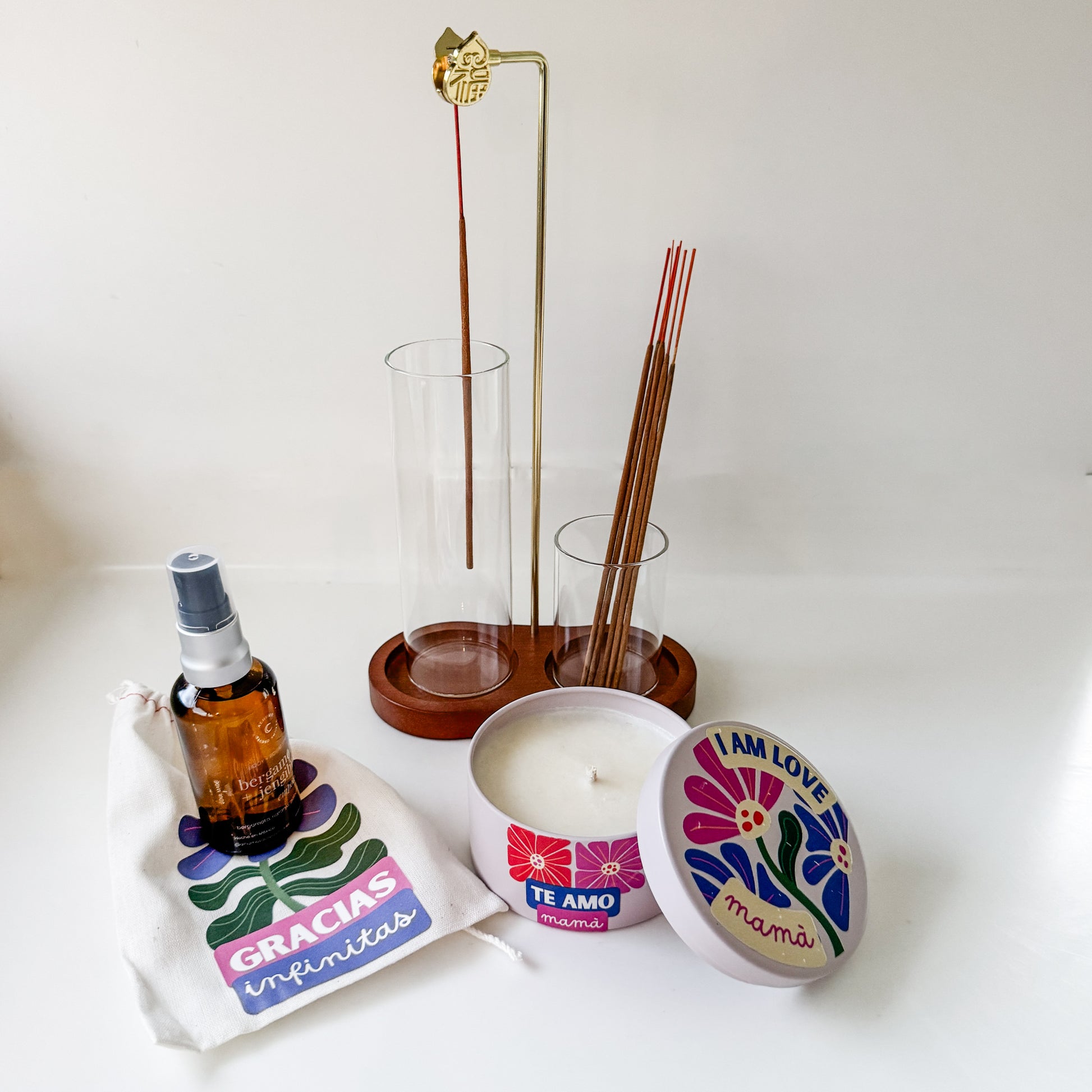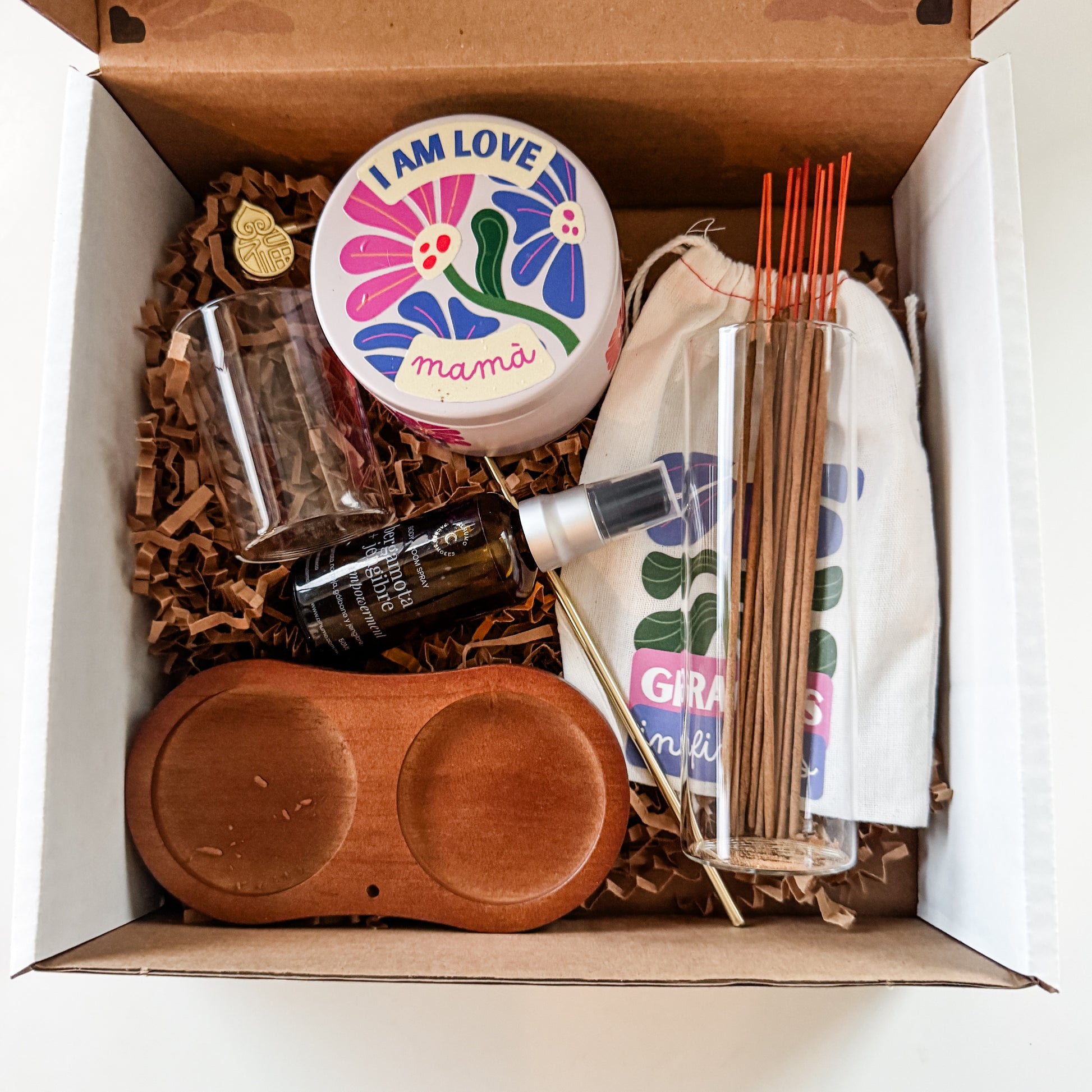 Contenido y Dimensiones1. Vela Aromática en Lata: Cera de soja con esencia de Caoba y Sándalo. Etiqueta decorativa con la frase "I am love, mamá". 2. Home & Body Mist (60ml): Frasco de vidrio ámbar con atomizador. Aroma Bergamota y Jengibre. 3. Set de Inciensos: 20 varitas de incienso artesanal con aroma a Palo Santo natural. 4. Inciensero de Lujo (Holder): Base de madera sólida con doble cavidad y soporte de metal dorado para colgar el incienso de forma invertida. 5. Cilindro de Cristal: Tubo protector de vidrio para el incienso (mantiene la ceniza contenida). 6. Accesorios de Tela y Papel: Saquito de algodón "Gracias Infinitas", Lista de Agradecimiento y Guía del Ritual de Descanso. ¡No te quedes sin este kit mágico! Aprovecha su precio de lanzamiento y el envío gratuito. Cambia tu energía. Cumple tus intenciones. 100% artesanal, orgánico y sustentable. Soul Made. Low waste. *Nuestros productos están hechos a mano con ingredientes puros y sagrados que se envuelven delicadamente para protegerlos. |