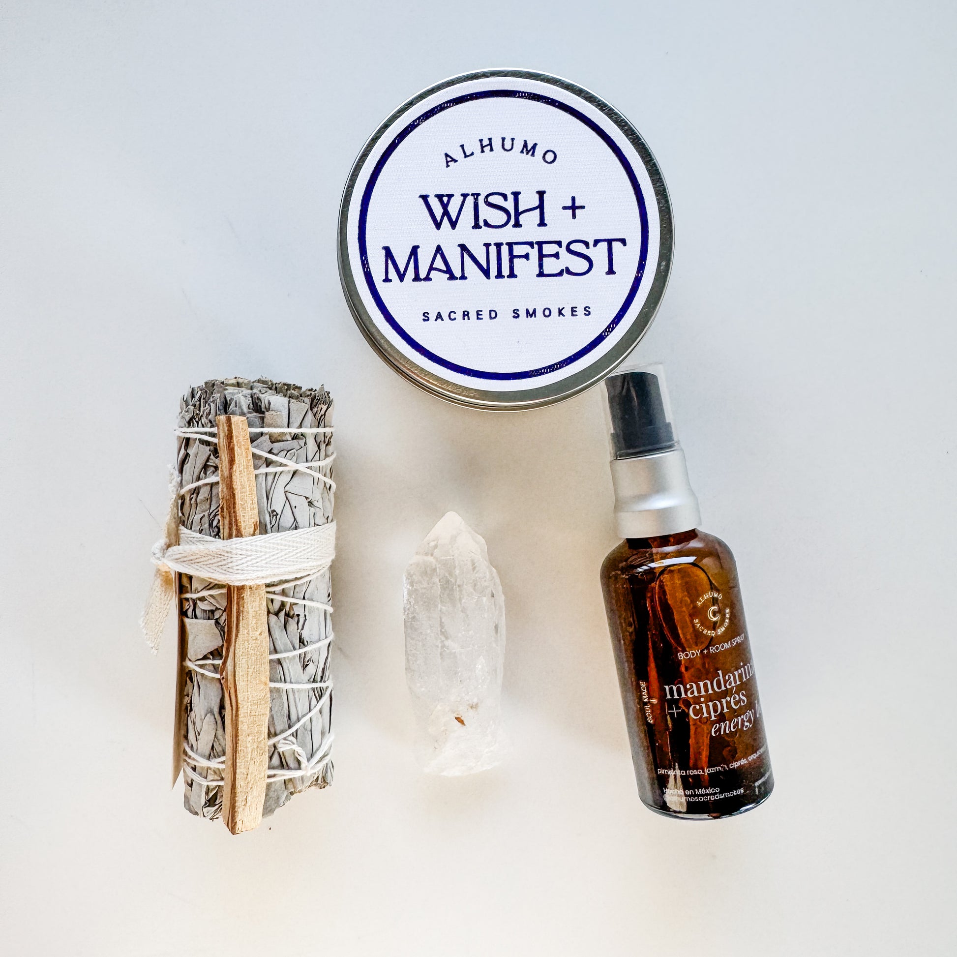 DescripciónEste kit es un portal hacia tus sueños y proyectos que están por florecer. Diseñado para quienes creen en el poder de sus pensamientos y la energía de sus intenciones. Cuando decides que es momento de comenzar algo nuevo necesitas herramientas que eleven tu vibración y te recuerden tu poder creador. Este kit combina elementos que activan tu energía, purifican tu espacio y te ayudan a manifestar desde un lugar de claridad y confianza. La magia de este kit está en la sinergia de sus elementos: la salvia y el palo santo limpian el camino para que tus nuevas intenciones florezcan sin obstáculos, el cuarzo cristal amplifica tu energía manifestadora, el mist Energy Boost te mantiene motivado y lleno de creatividad, y la vela Wish & Manifest crea el ambiente perfecto para visualizar y atraer lo que deseas. ¿Cuándo usar este kit? ✺ Cuando estás iniciando un nuevo proyecto, emprendimiento o capítulo de tu vida