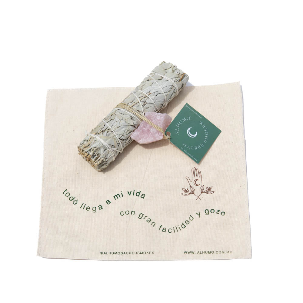Contenido y DimensionesEn este kit mágico encontrarás… ⋇ Salvia Blanca de 15 a 18 cm. envuelta en pétalos de rosa (4-5 cm diámetro, 80g aprox.) |